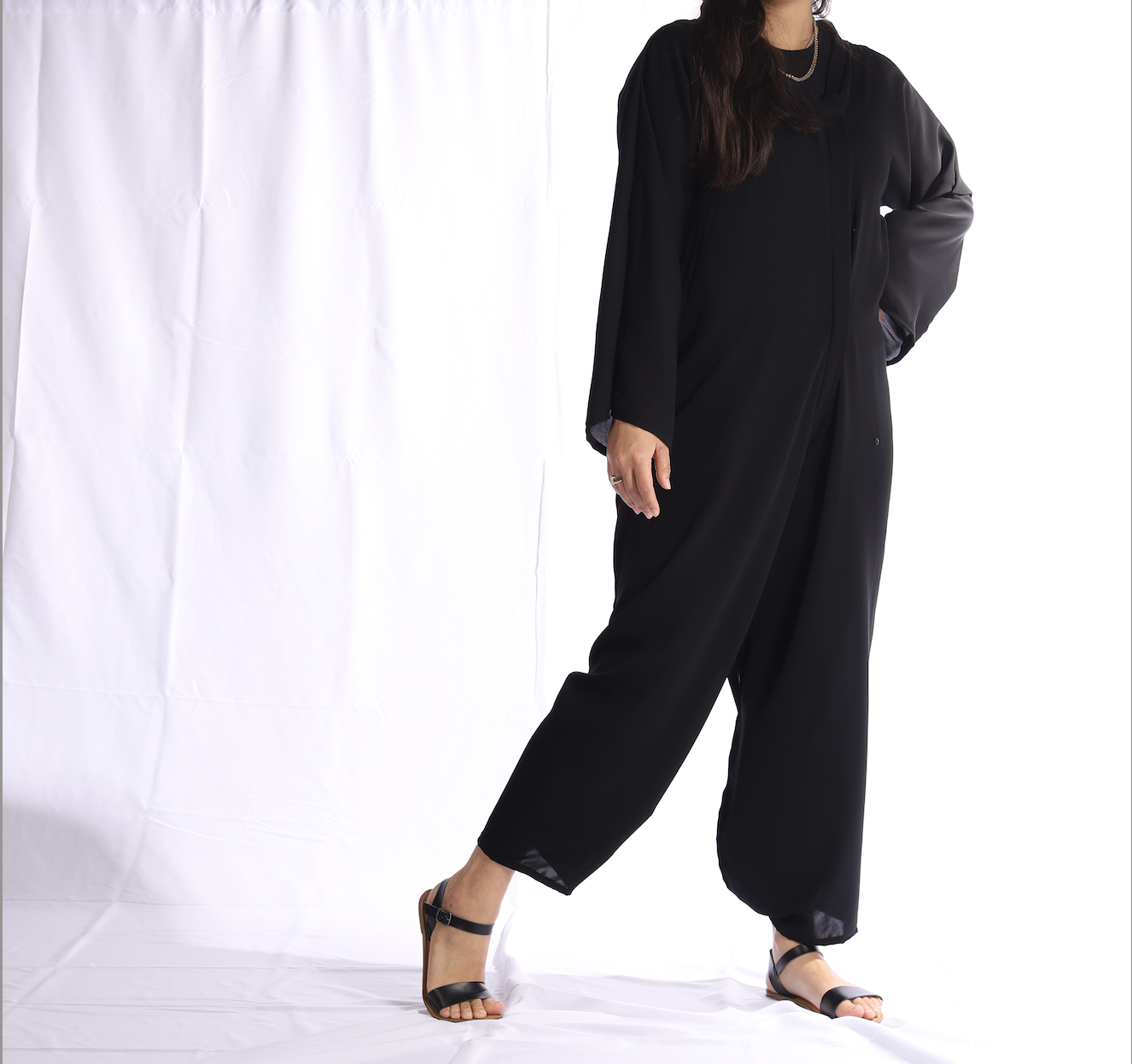 In its robe form, the Tahwheel abaya looks like a traditional front-opening abaya. But hidden snap fasteners enable a rapid transformation.