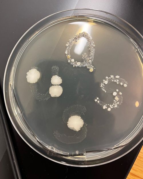 “Sympoietic alphabet: monera, animal” displays letters shaped by bacteria collected from my mouth and skin, and grown along trails scored into agar plates. Small collections of bacteria reproduced and bloomed in circular and fractal shapes along the lines that I made, making letterforms composed of overlapping areas. In this iteration, the alphabet is incomplete as the bacteria have been growing on a timescale that did not suit the human-imposed deadline of this project.