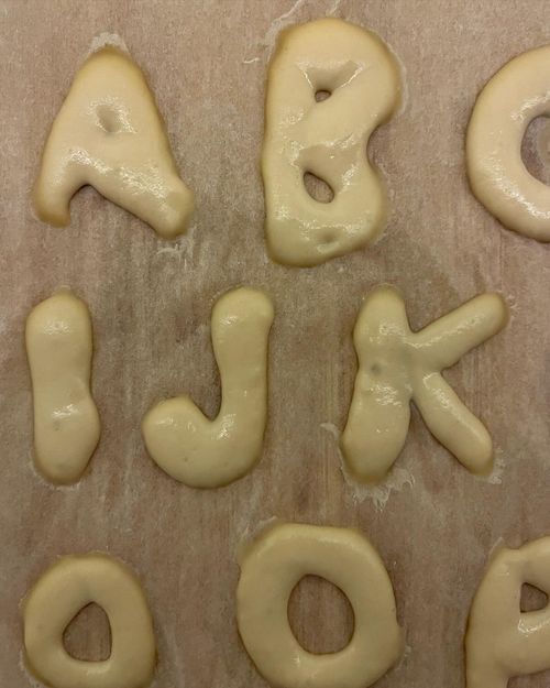 “Sympoietic alphabet: fungi, animal” is a co-creation with wild yeast from the air inside my home. Using methods from sourdough bread baking, I contained and fed a colony of these yeast for several months. I mixed part of the colony with flour and water and piped the mixture into capital letters, then waited 48 hours while the yeast consumed the flour/water mixture, reproduced, and expelled gasses that swelled and rounded the shapes of the letters.